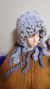 クラゲ〜!実際被ってみるとショートヘアの私にとって下から生える触手がなんか慣れない感覚〜?扱いが難しくてロングヘアの方々すごいなぁと思いました!もこもこふわふわで暖かく過ごせる帽子になりました!
